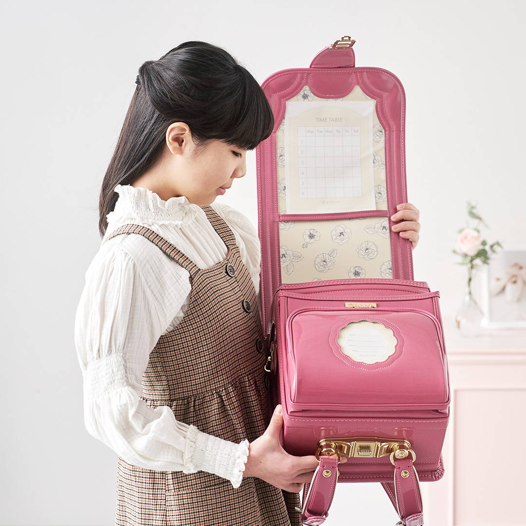 フタを強く折り曲げたり、反ったりすると、縁にシワが寄る原因に。荷物を出し入れする時は、写真のようにランドセルを寝かせてからフタを開け閉めすると、きれいな状態を保てます。