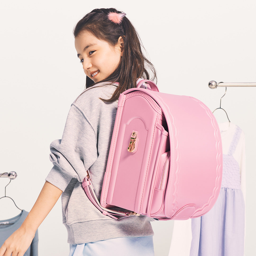いろいろな洋服に合わせやすい、ほんのりピンクがかったパールホワイトのランドセル。ホイップクリームのようなキュートな雰囲気で、背負えばとびきりスイートな気分に。