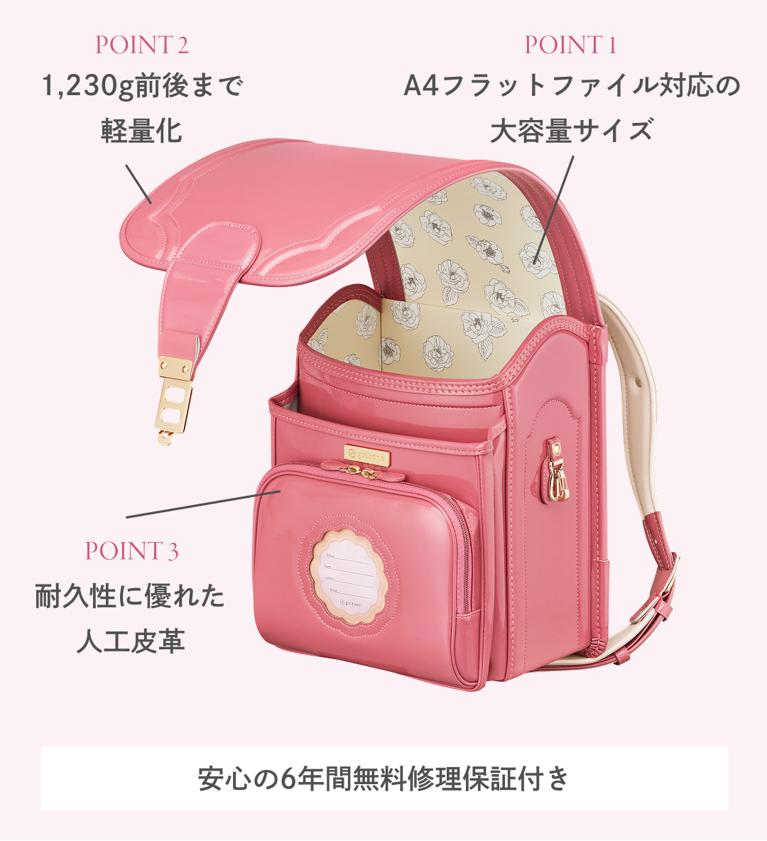 1,230g前後の軽量仕様で、A4フラットファイル対応。6年間を支える確かなつくりと、自動ロックや反射材など機能も充実。どのモデルを選んでも、サイズ・重さ・機能は共通です。